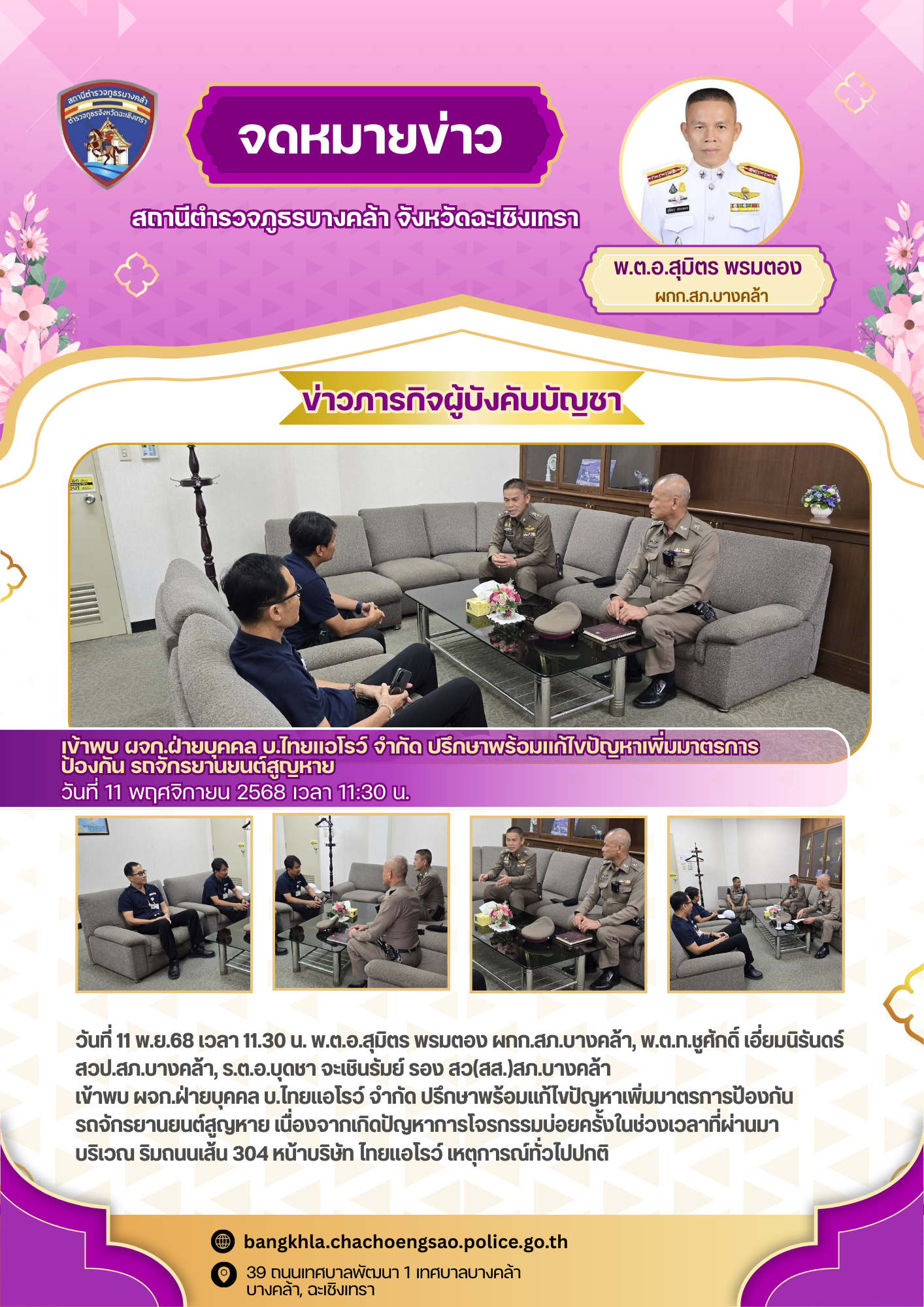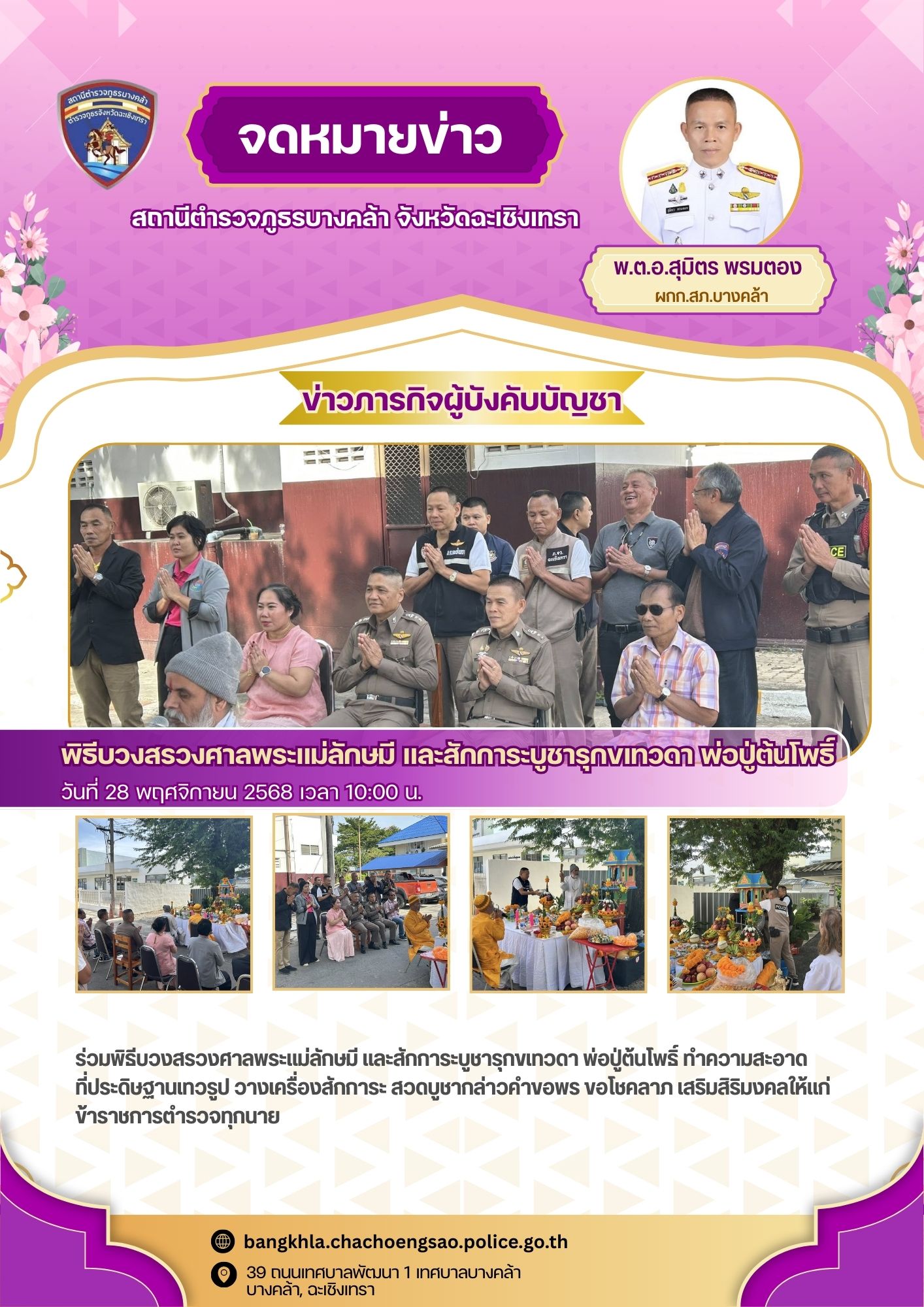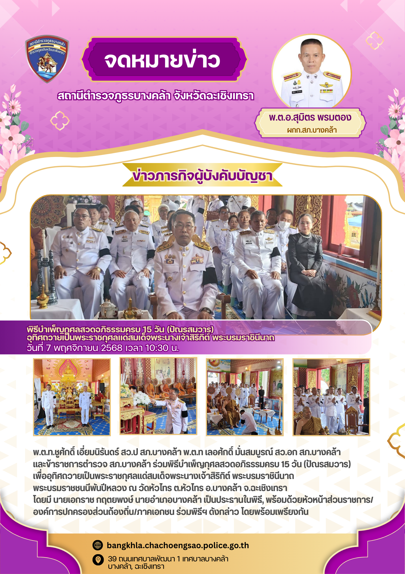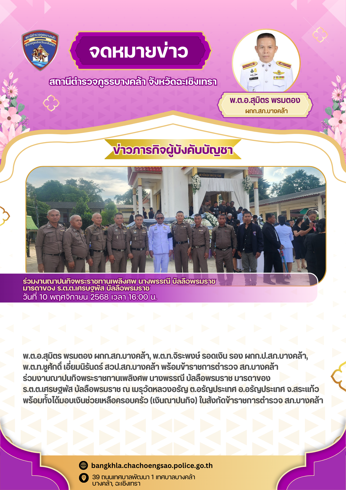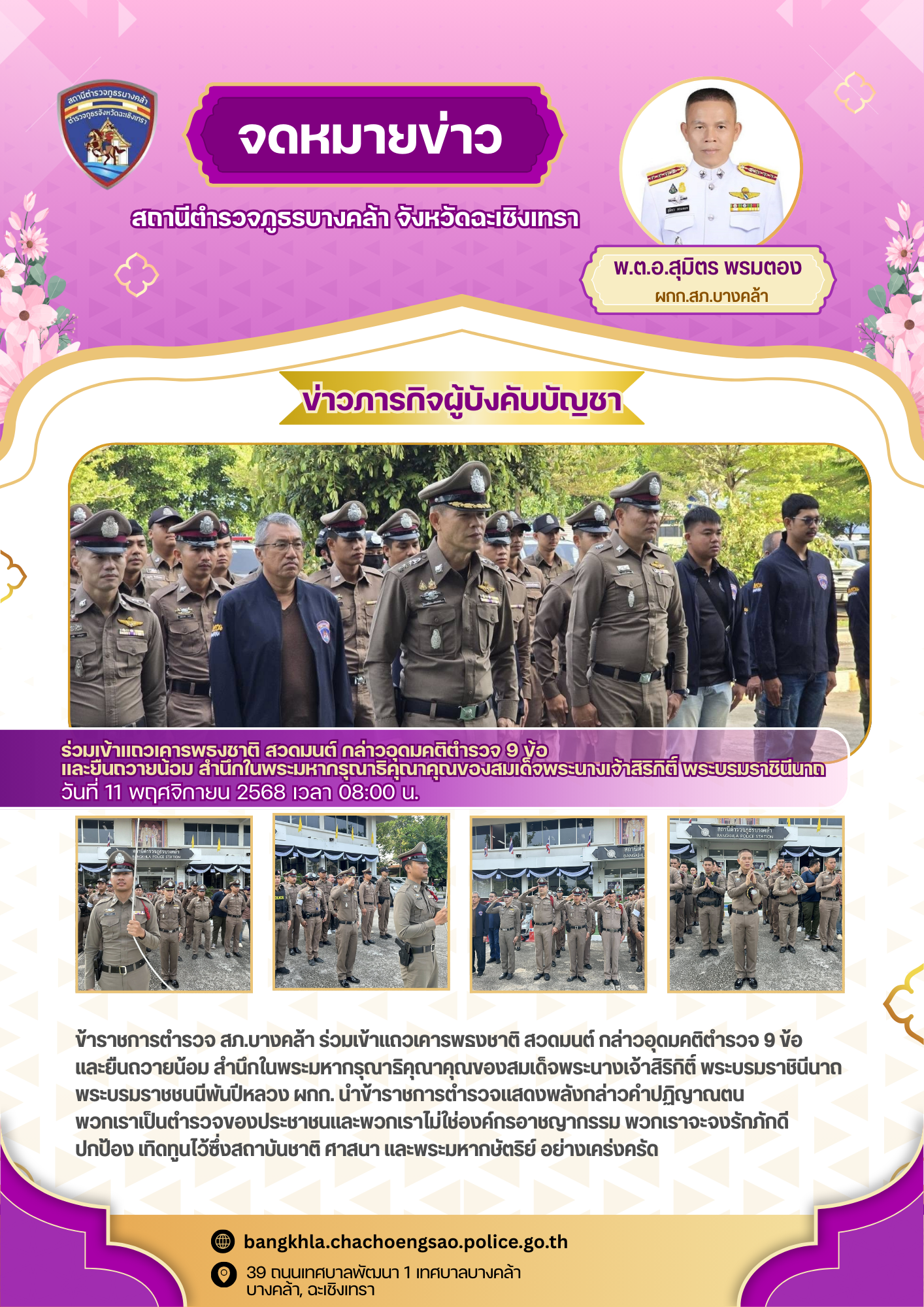 วันพฤหัสบดีที่ 20 พฤศจิกายน 2568 เวลา 18.00 น. – พ.ต.อ.สุมิตร พรมตอง ผกก.สภ.บางคล้า – พ.