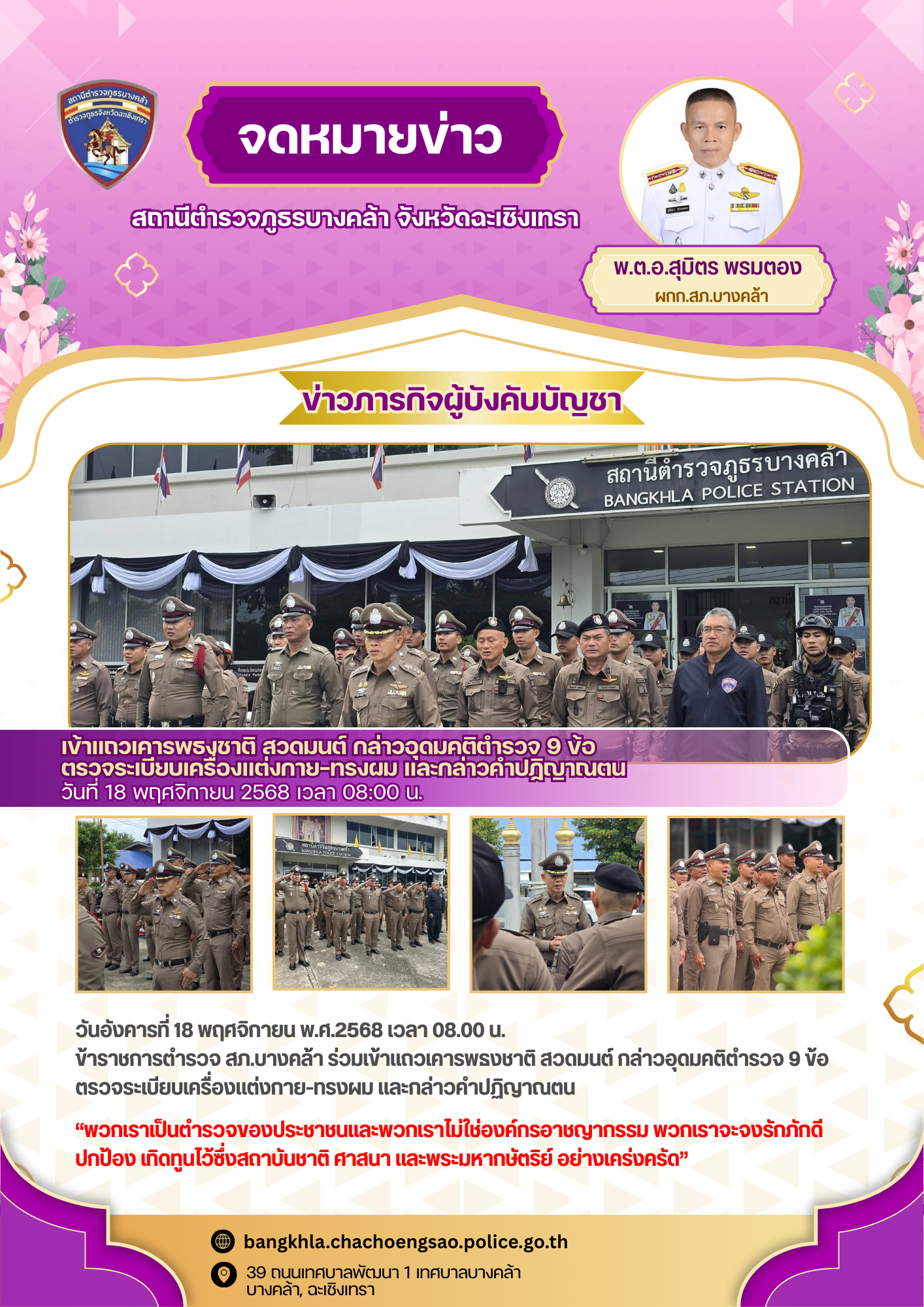 วันอังคารที่ 18 พฤศจิกายน พ.ศ.2568 เวลา 08.00 น. – พ.ต.อ.สุมิตร พรมตอง ผกก.สภ.บางคล้า –