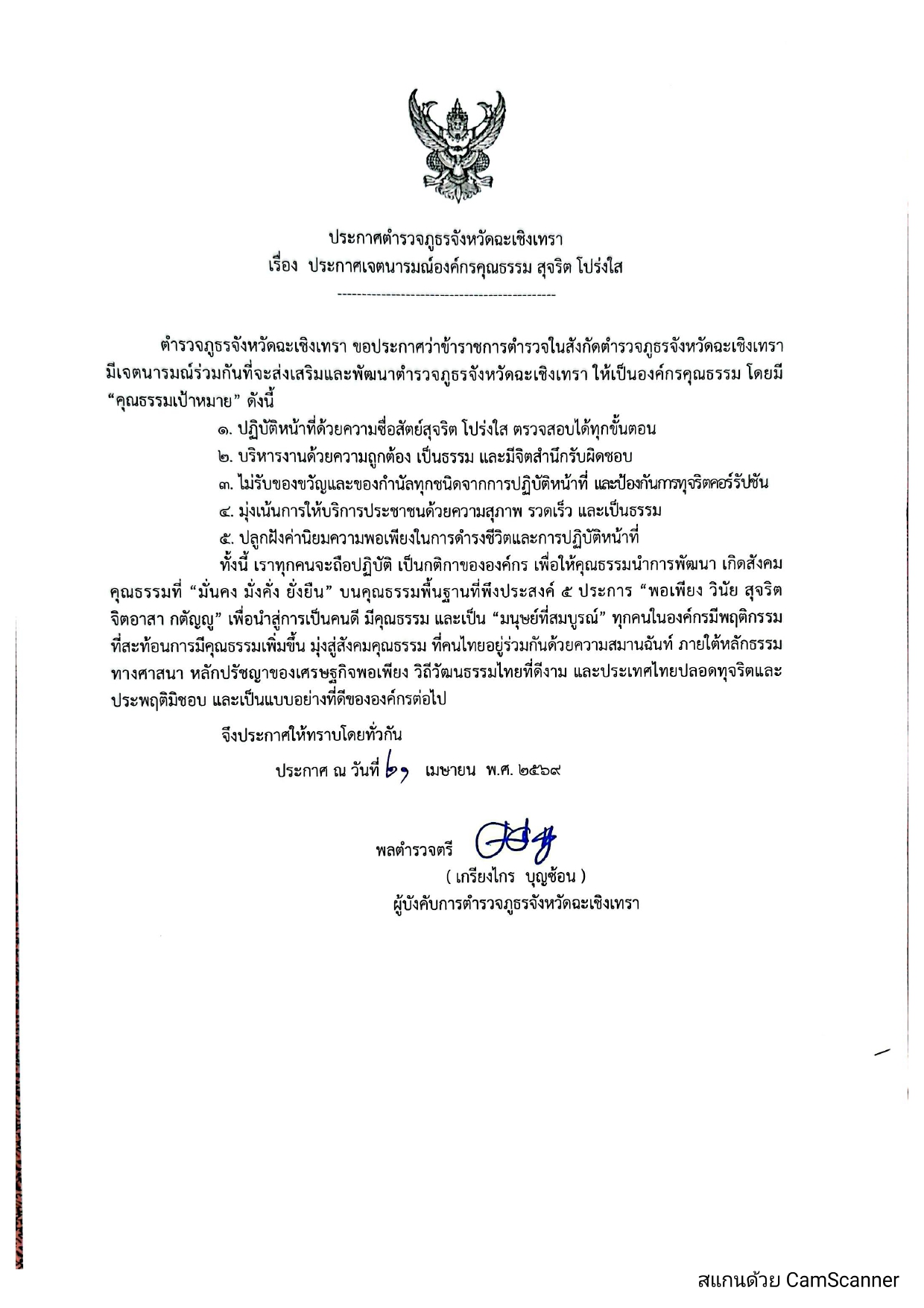 ประกาศเจตนารมณ์องค์กรคุณธรรม สุจริต โปร่งใส ตำรวจภูธรจังหวัดฉะเชิงเทรา 22 เมษายน 2026 โดย admbangkhla