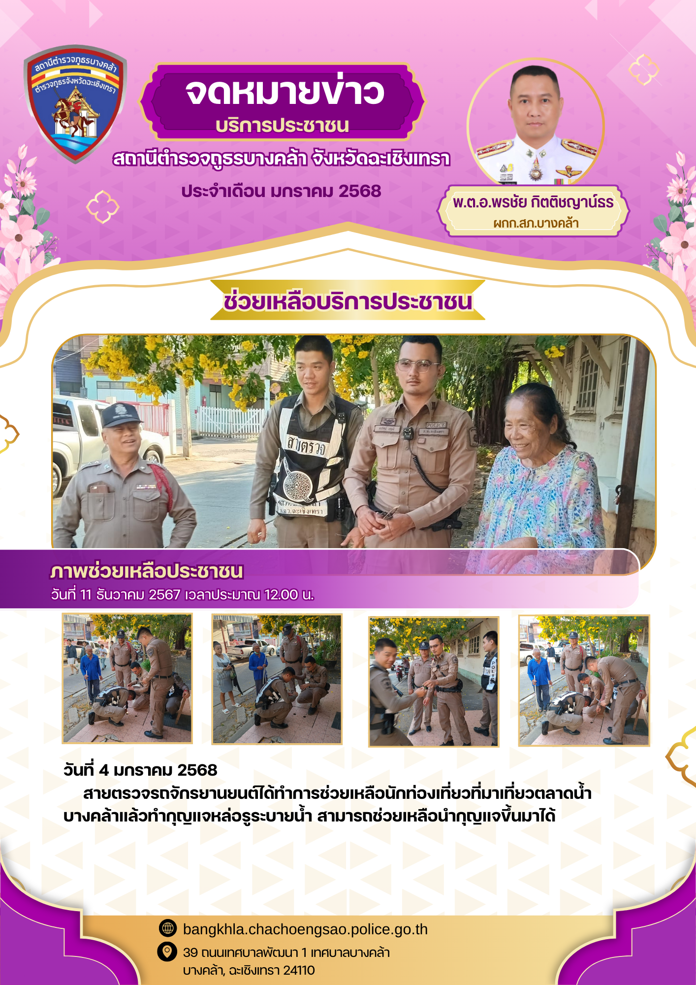 วันที่ 4 มกราคม 2568 สายตรวจรถจักรยานยนต์ได้ทำการช่วยเหลือนักท่องเที่ยวที่มาเที่ยวตลาดน้ำบ