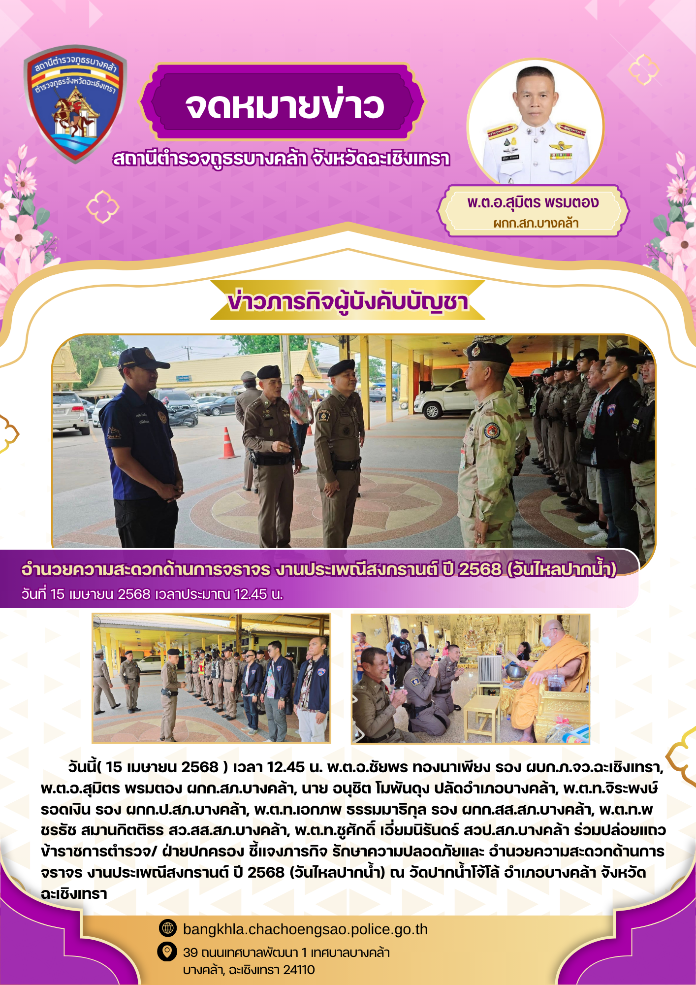 วันนี้ ที่ 14 ม.ค. 69 เวลา 13.00 น. พ.ต.อ.สุมิตร พรมตอง ผกก.สภ.บางคล้า พร้อมข้าราชการตำรวจ สภ.บางคล้