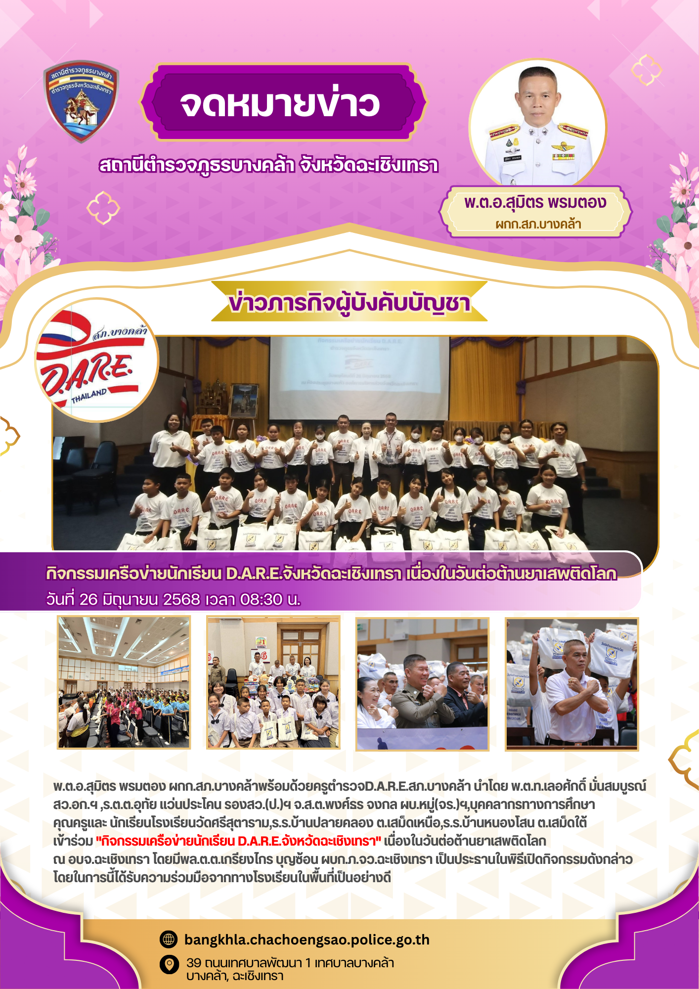 วันนี้ 26 มิ.ย.68 เวลา 08.30น. พ.ต.อ.สุมิตร พรมตอง ผกก.สภ.บางคล้าพร้อมด้วยครูตำรวจD.A.R.E.สภ.บางคล้า