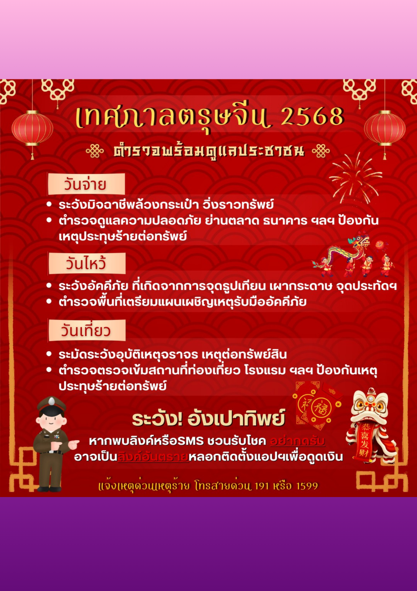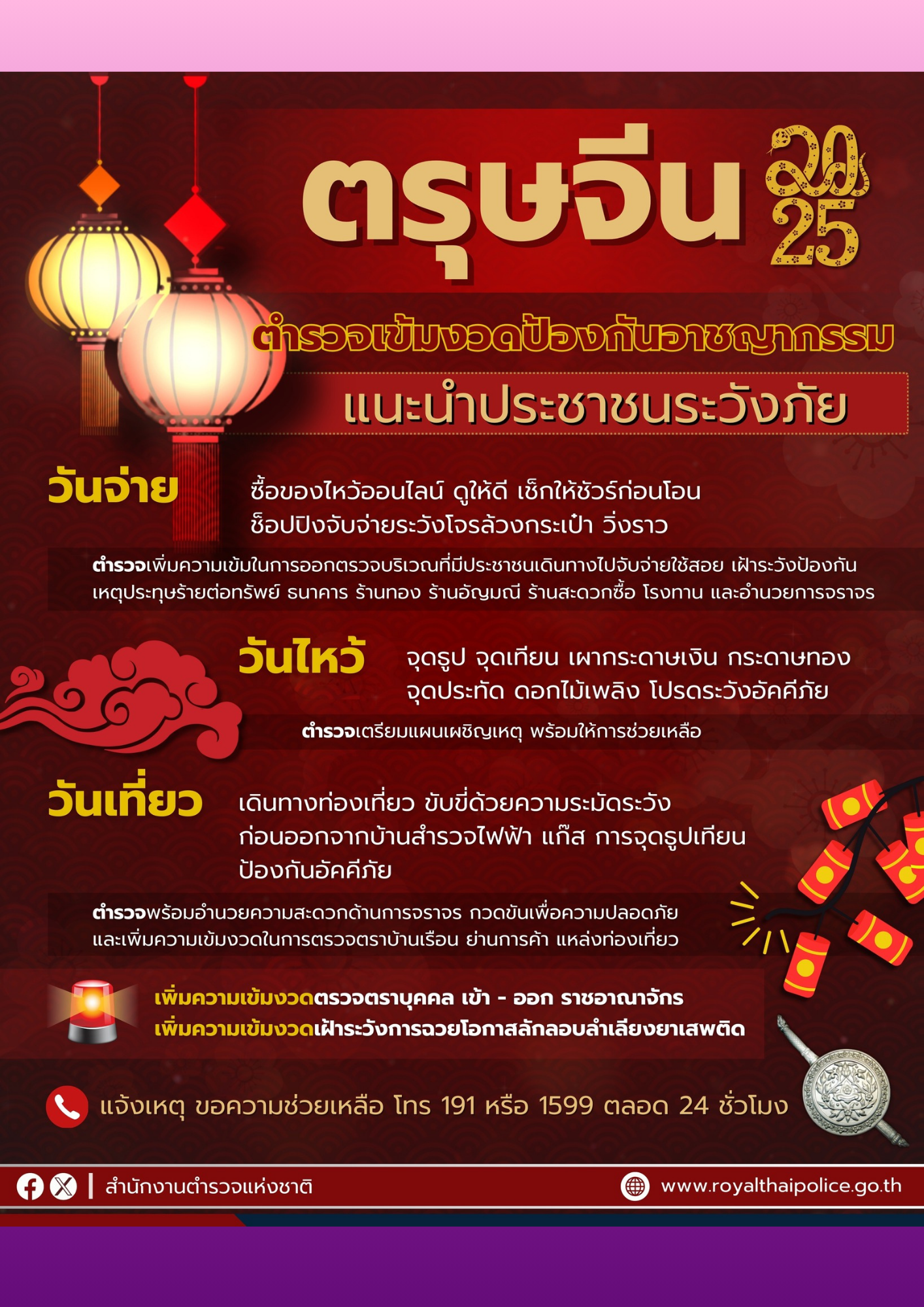 สำนักงานตำรวจแห่งชาติมีมาตรการเข้ม ดูแลประชาชนช่วงเทศกาล #ตรุษจีน 2568 ทั้งวันจ่าย วันไหว้