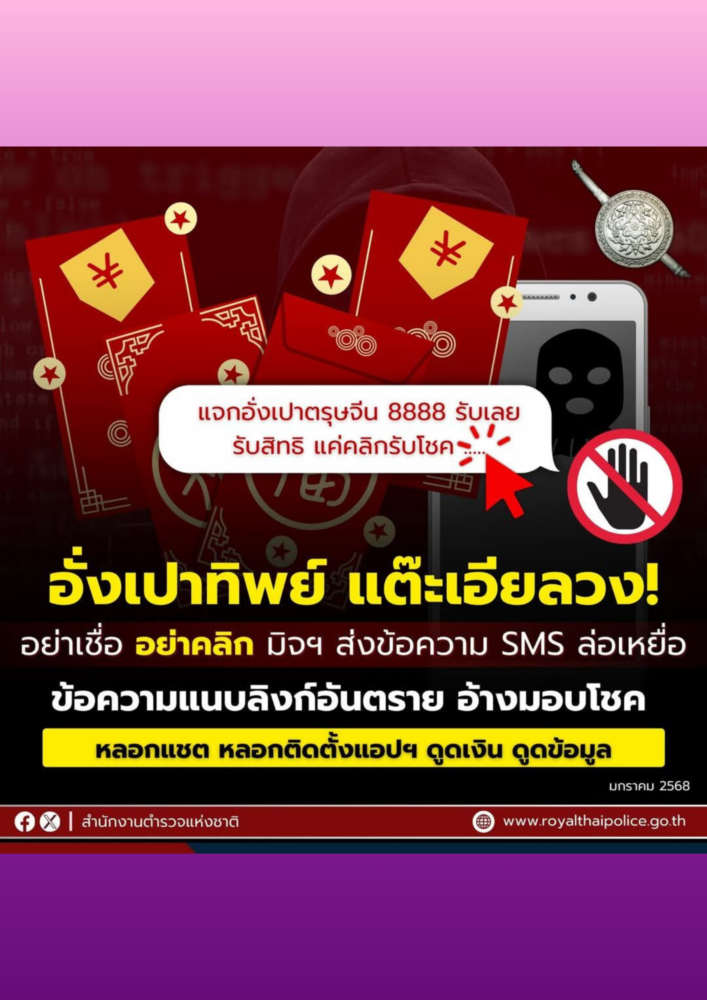 ระวัง!! อั่งเปาทิพย์ แต๊ะเอียลวง#ตรุษจีน มุกนี้กำลังมา ส่งข้อความ SMS ลวงว่าโชคดี ให้คลิกรับอั่งเปา