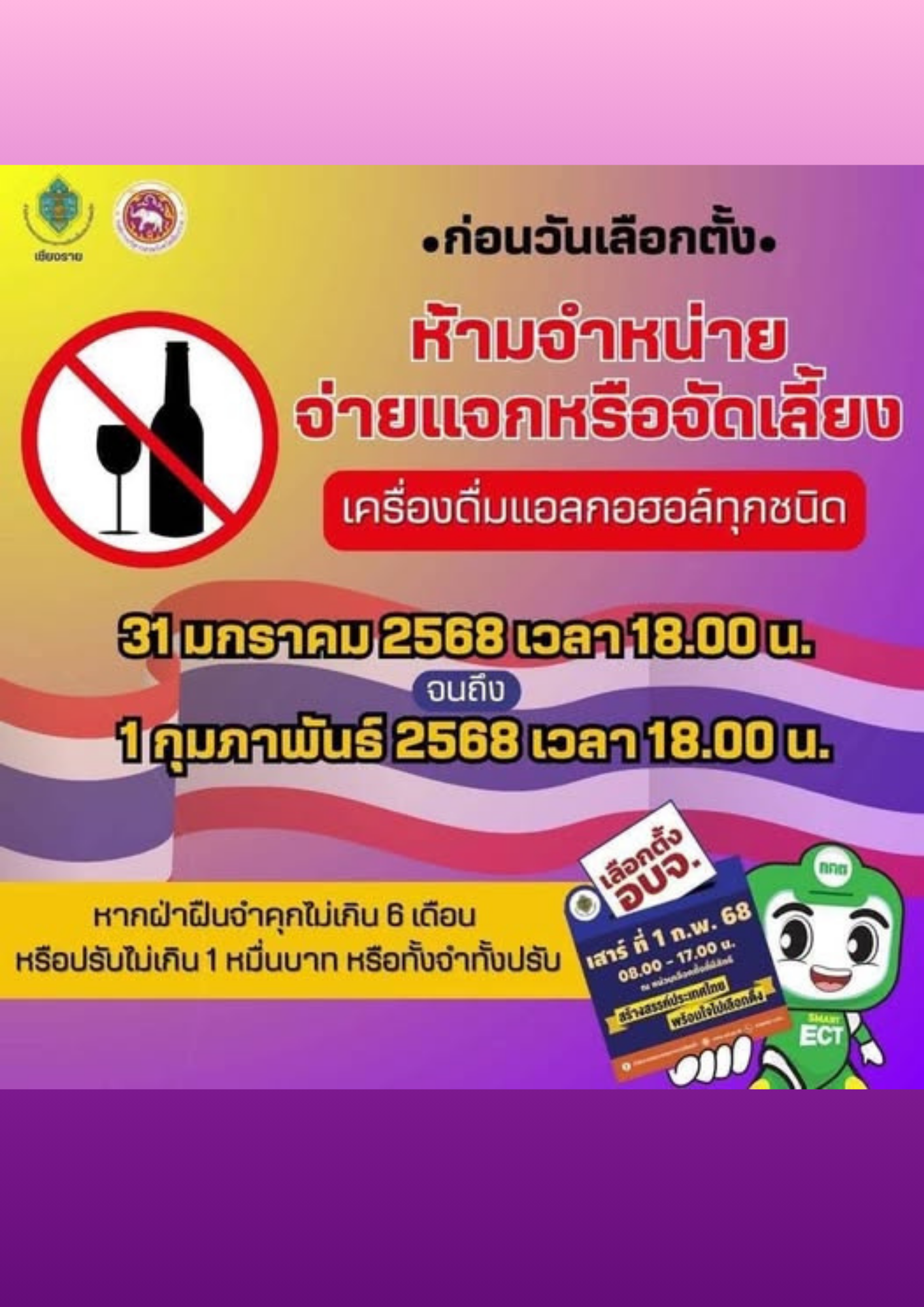 ประชาสัมพันธ์วันเสาร์ที่ 1 กุมภาพันธ์ 2568 วันเลือกตั้ง อบจ.ฉะเชิงเทราห้ามจำหน่ายสุรา จ่ายแจกหรือจัด