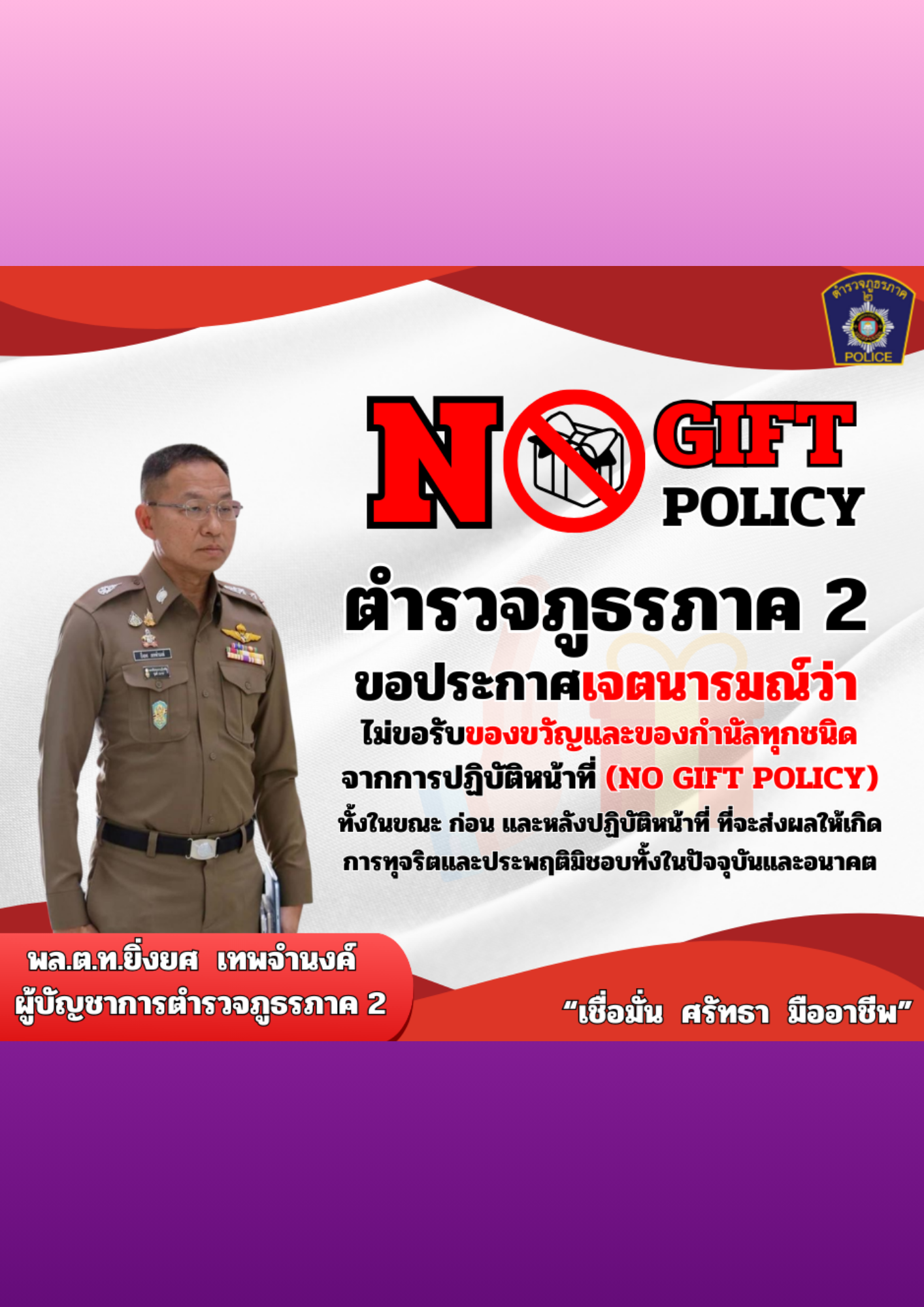 ตำรวจภูธรภาค 2 ประกาศเจตนารมณ์ “No Gift Policy” ไม่รับของขวัญ-ของกำนัลทุกรูปแบบ ตามนโยบายของสำนักงาน